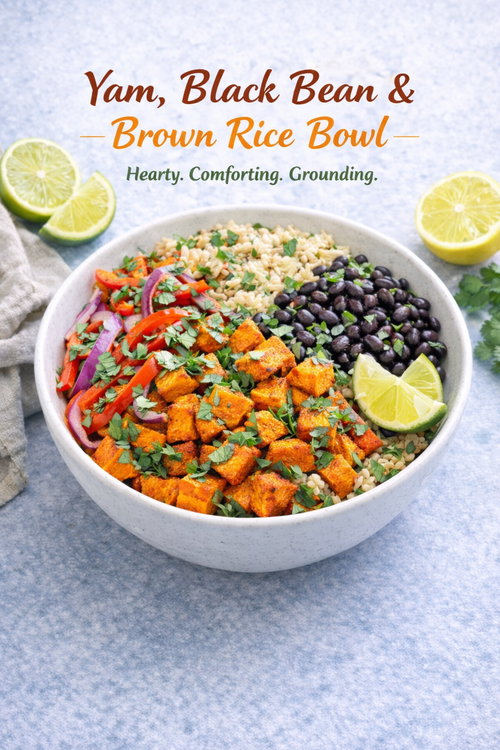 - In a bowl, layer rice, beans, roasted yams, bell pepper, and onion.
